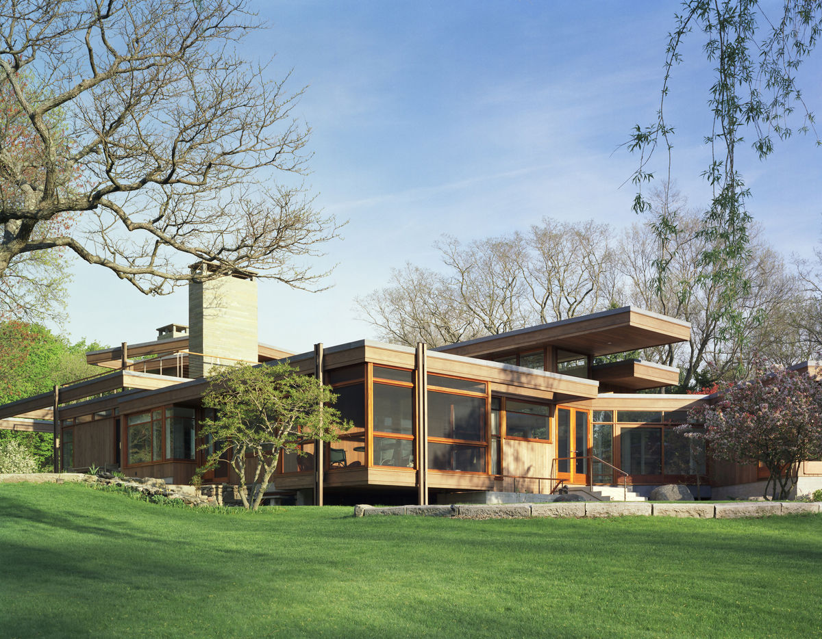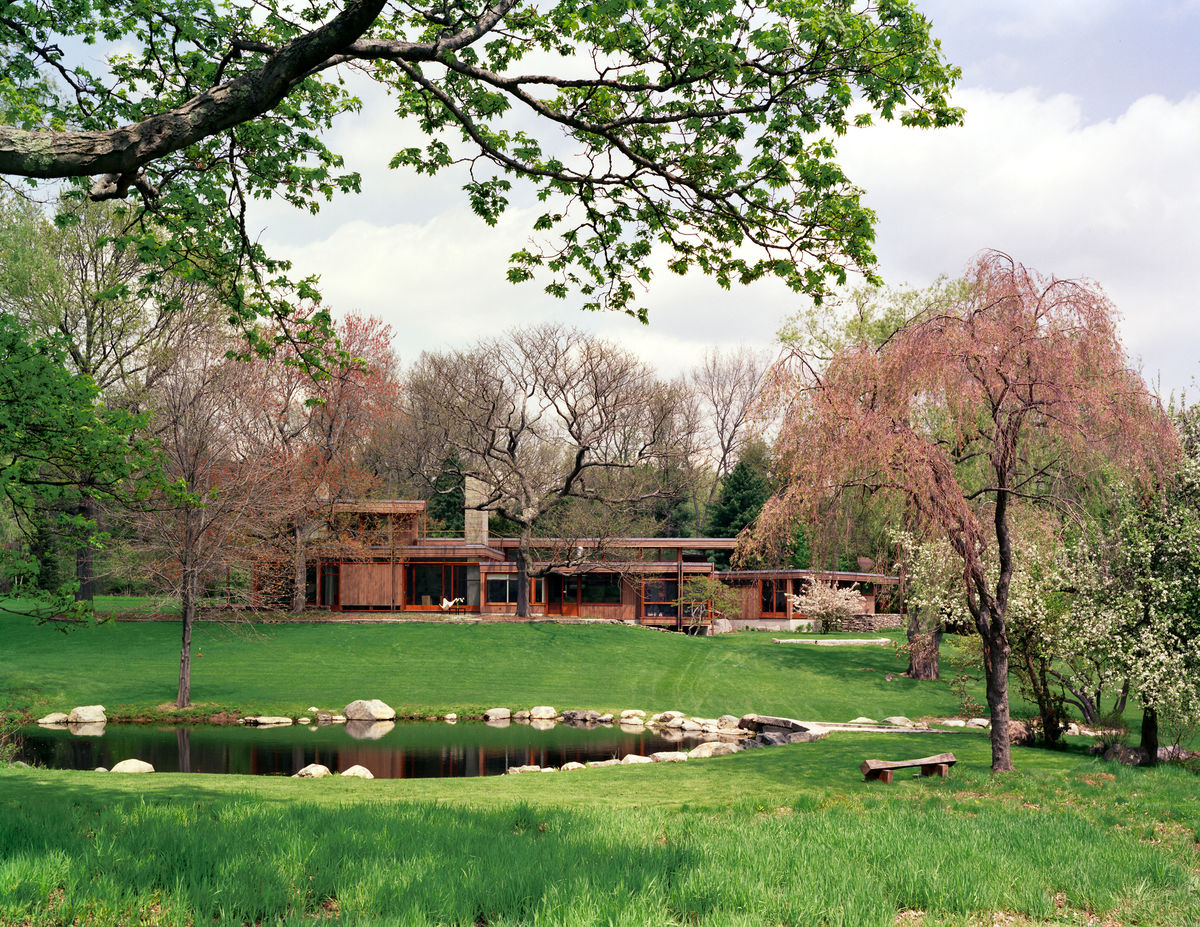 Occupying the space between the ground and the tree canopy, this house is conceived as a series of horizontal planes that terrace along the edge of a south-facing hill above a pond—the guest wing, main living spaces, and bedroom wing all wrap along the hill’s crest. The house is organized on the site to take advantage of the daily path of the sun. The kitchen faces east while the living room and its terrace face west to take advantage of the setting sun. All rooms receive light on two sides, and the combined living room, dining room, kitchen area receives light on four sides through the use of a clerestory, enabling the sun to be a continual and ever-changing presence in the main body of the house.
