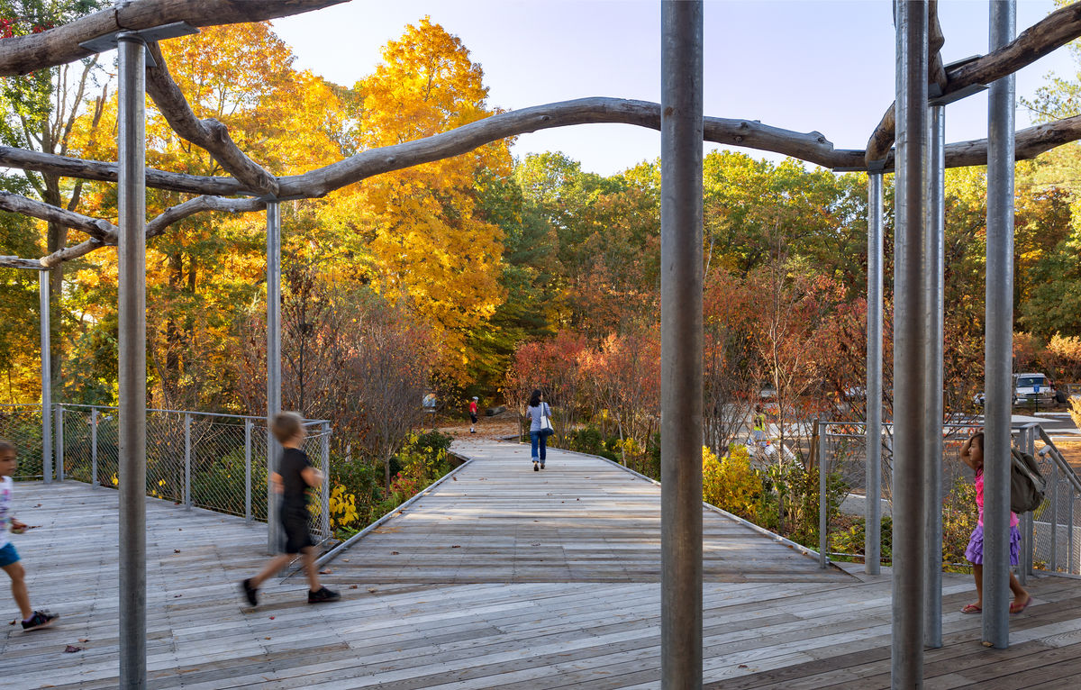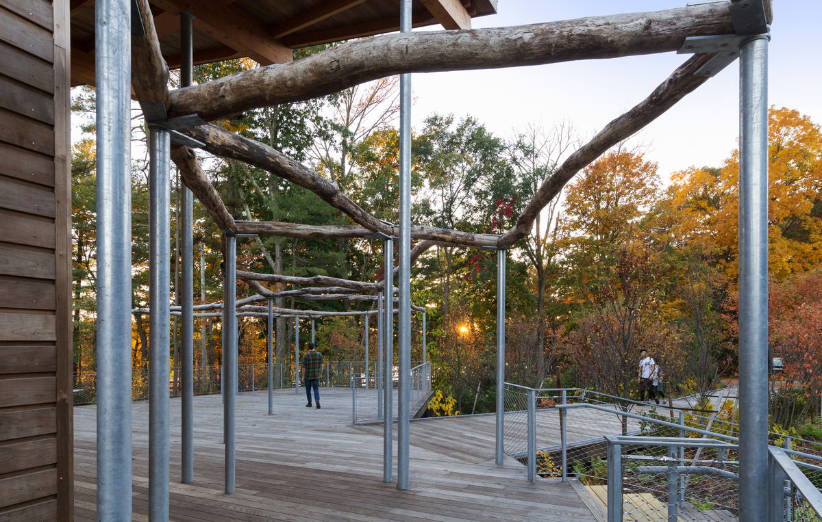 The 6,000 sf visitor center interweaves with the landscape in order to emphasize the pond and heighten the experience of the site. The building is nestled behind trees and shrubs giving it an air of mystery with a long accessible ramp to draw visitors into the visitor center. Exhibition spaces, a community meeting room and staff offices, create a new hub. A large open-air deck of locally source heat-treated ash with a black locust trellis, addresses the pond and provides a moment of repose at the building’s entry.