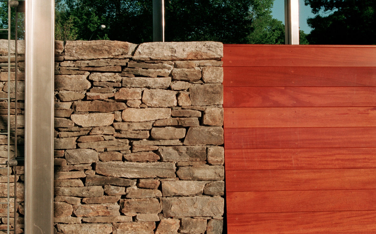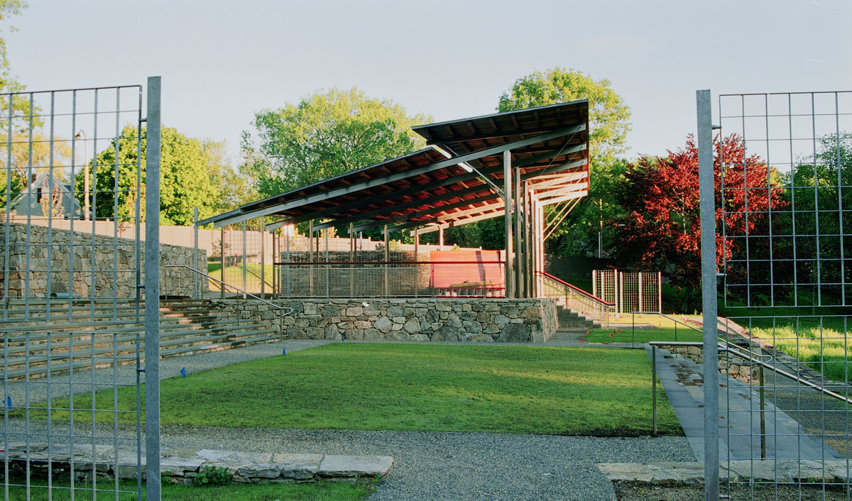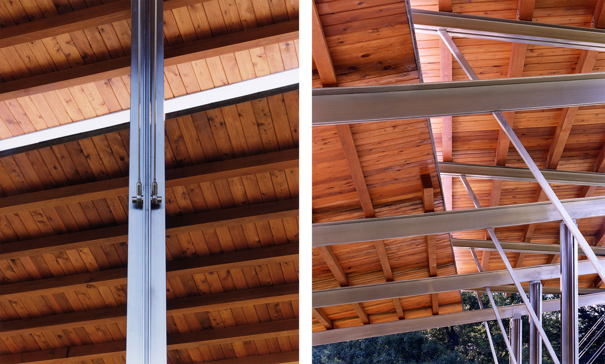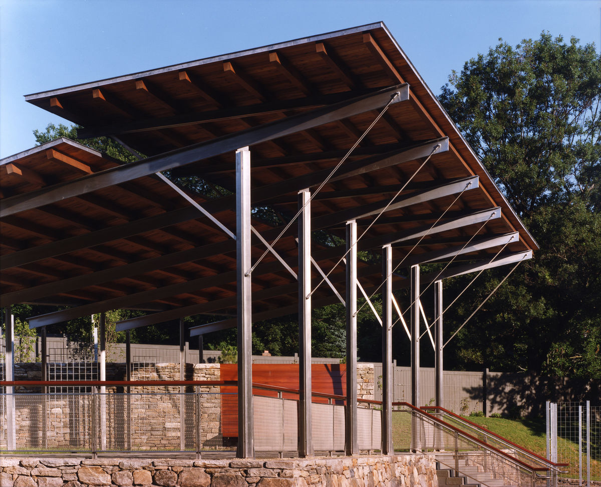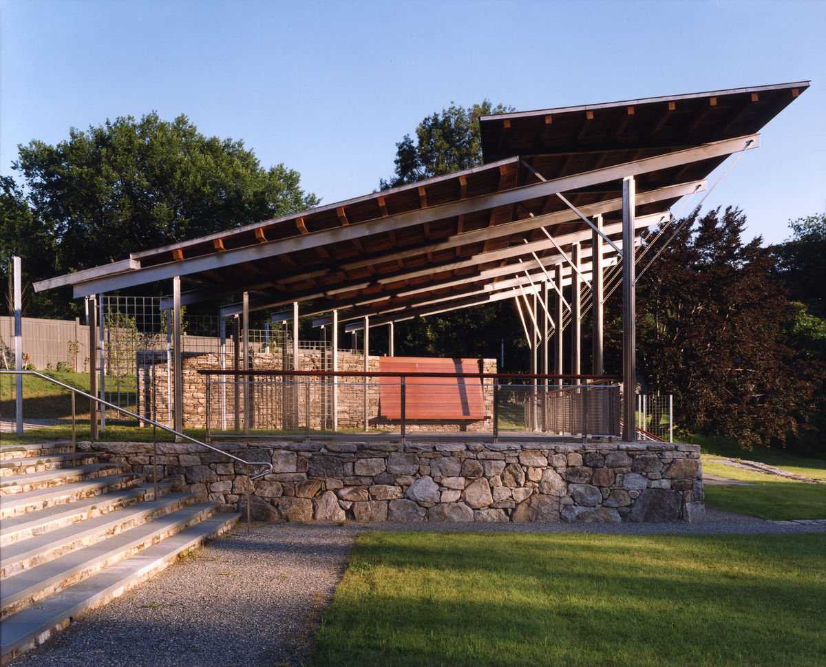 The pavilion structure, designed by MTA, serves as an outdoor classroom and a place of repose, and is a focal point within the overall composition of the gardens. As one approaches the pavilion along the great wall, vine trellises occlude views to the planted terraces and gradually reveal the pavilion. Brushed stainless steel beams and columns support a roof of lead-coated copper over natural tongue and groove cedar. The juxtaposition of the wood elements with the stainless steel allows for a reading that is both modern and richly textured. Two sections of wood and metal roof float overhead with a slot of space between allowing shafts of southern sun and views of the sky to penetrate to the terrace below. The exquisitely crafted stone walls which form a base for the structure connect it to the terraces and the hills and trees in the background.
