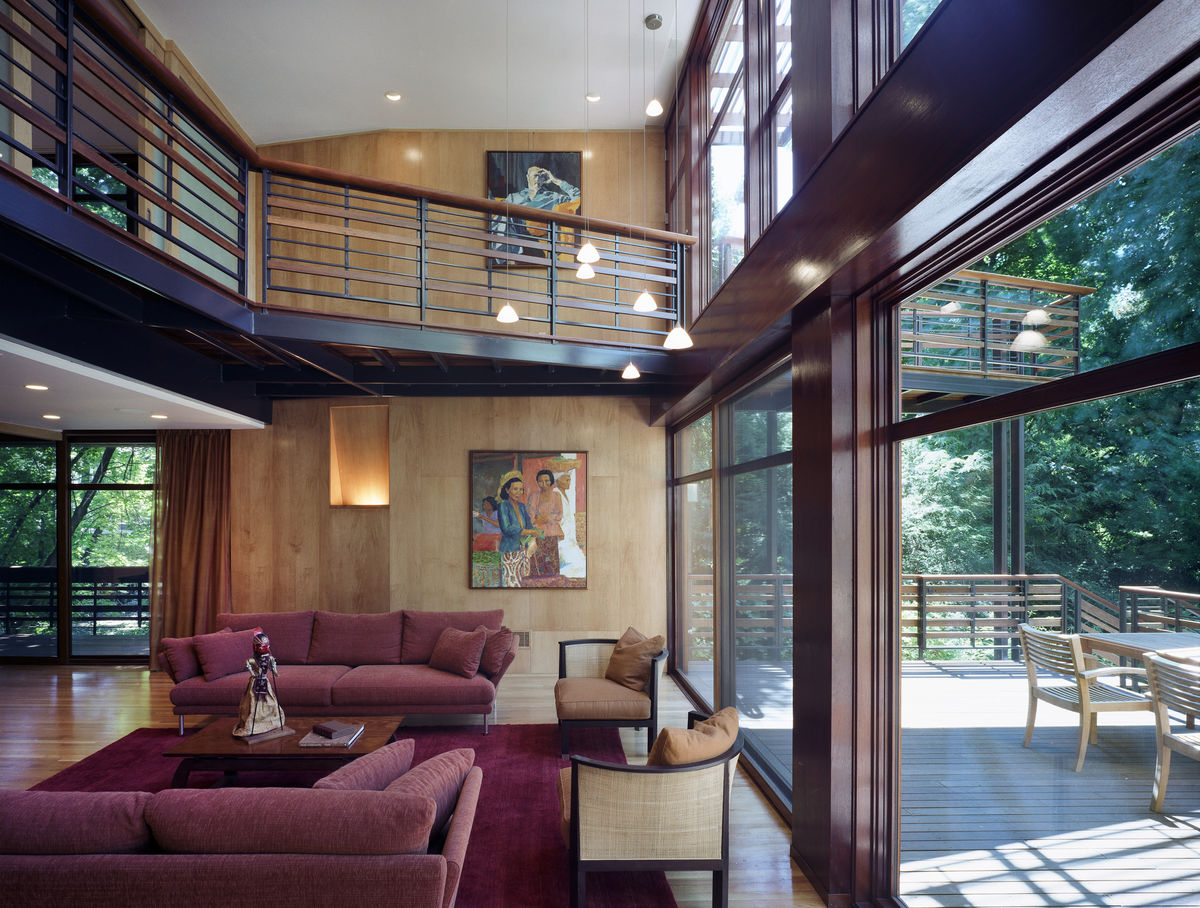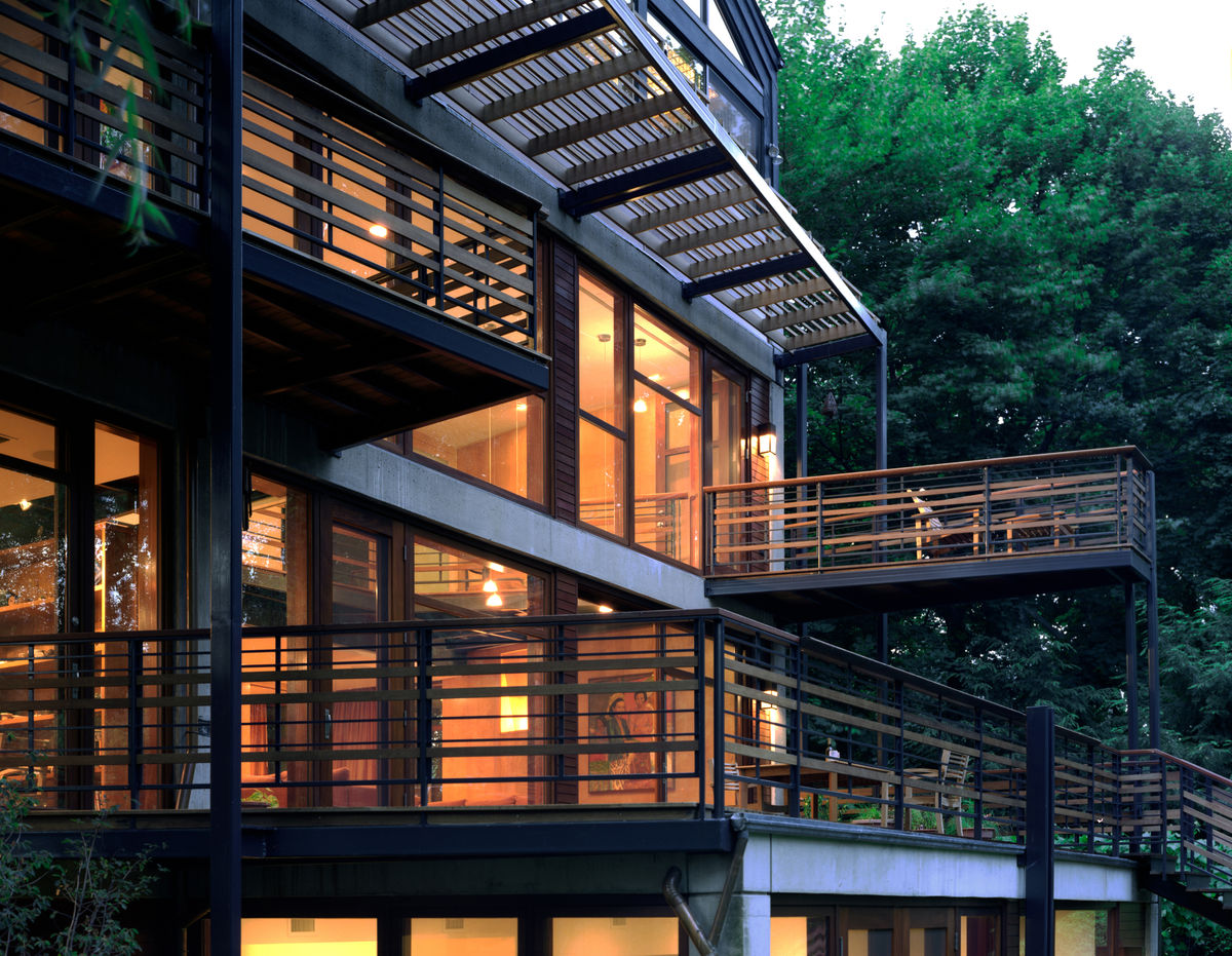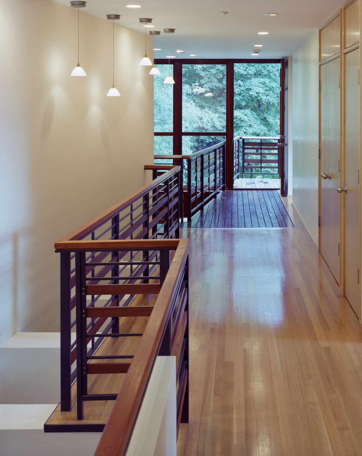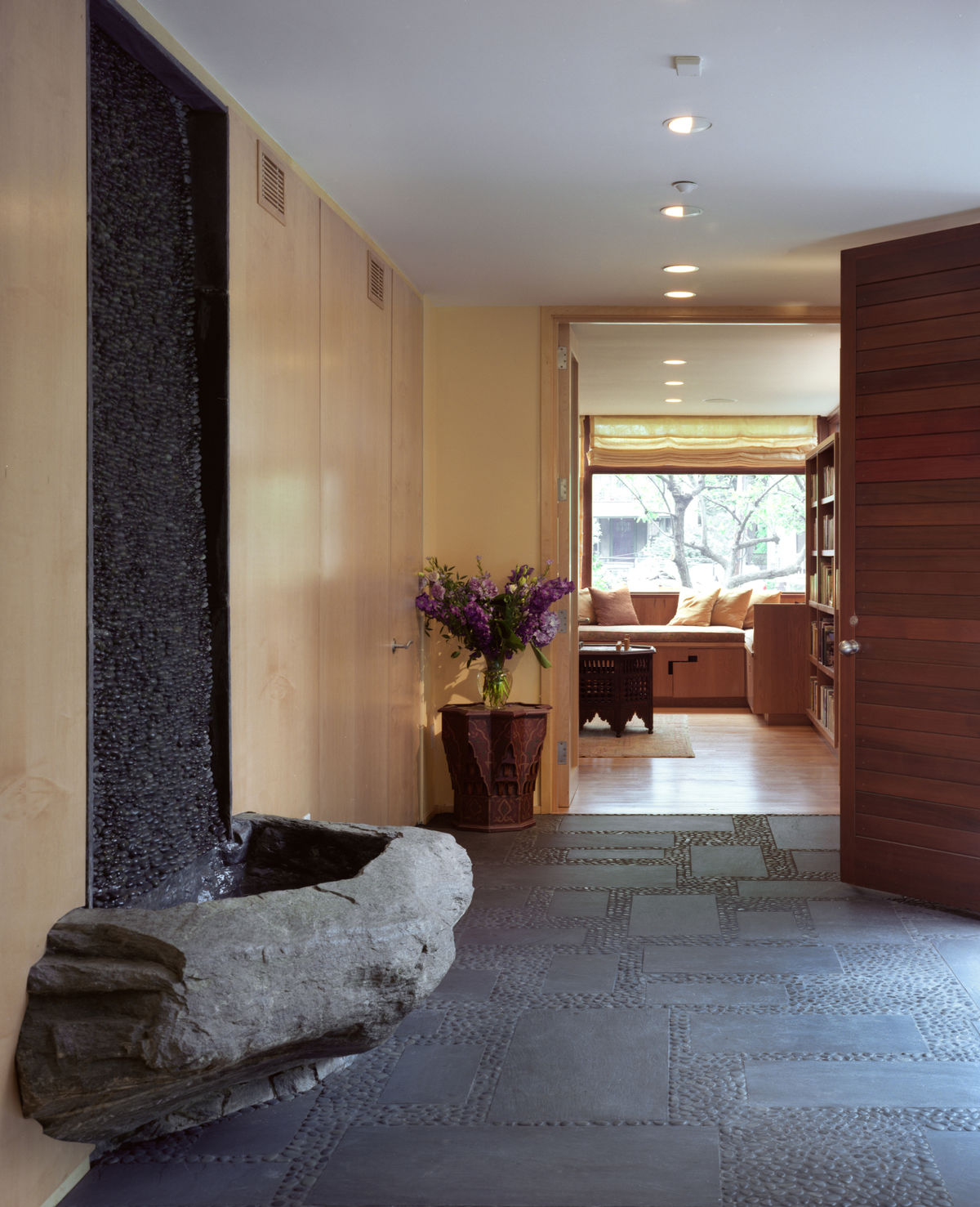 This project transformed a four-story, double-gabled, concrete-framed school into a private residence for a family of five, turning a stark institutional space into a warm and inviting home. The plan introduces new scales of occupation and varied spatial qualities. Emphasis on the warmth of materials, texture in details, and flow of movement juxtapose the regularity of the existing structure with the idiosyncrasies of a more personalized space. An unfolding sequence begins at the entry, where a pebble path and stone fountain create a moment of transition and stasis between outside and in. The compressed spaces created by the eight-foot ceilings of the former school are interrupted by a mahogany-slat ceiling plane that offers glimpses of the second floor through its spaces. The opening and expansion continues in the living room, where the vaulted two-story ceiling creates an atrium with a wraparound mezzanine above. Materiality has been brought into the structure with an emphasis on warm materials and texture in details. Light filters through 18-feet of mahogany-framed windows, warming the space through solar gain. A trellis system on the outside deck shades the living room against intense summer sun and dapples the light along the interior.