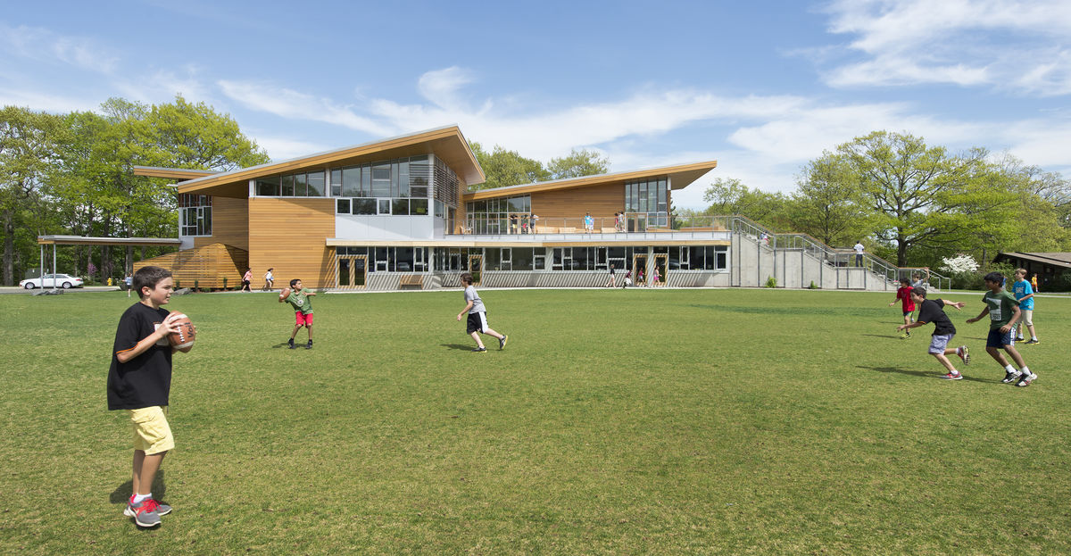 The new science and technology classroom and laboratory building at Foote School is designed to be a state-of-the-art sustainable facility. The building uses both common sense passive strategies as well as active renewable energy systems to create a building that is a dynamic teaching tool for students. Deep overhangs and wood louvers wrap the southern and western exposures, preventing heat gain in the warm months while allowing sunlight in during the winter. The classrooms and labs are lined with large walls of glass, allowing a heightened awareness of the daily traverse of the sun and reducing the use of electric lighting through day-lighting. A louvered awning facing the playfield both diffuses the daylight entering the western classrooms and operates as a solar-thermal hot water system. Operable windows set high in the walls, assisted by ceiling fans, encourage cross-ventilation through the stack effect. The super-insulated skin combined with PV roof panels reduces the buildings dependency on fossil fuels.