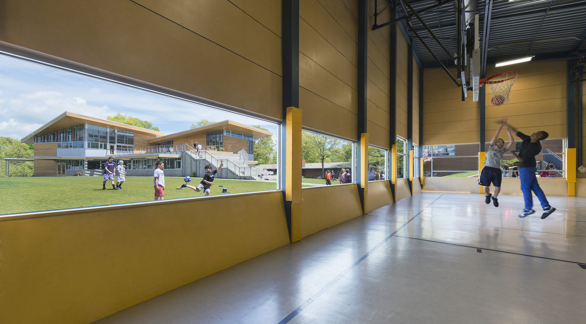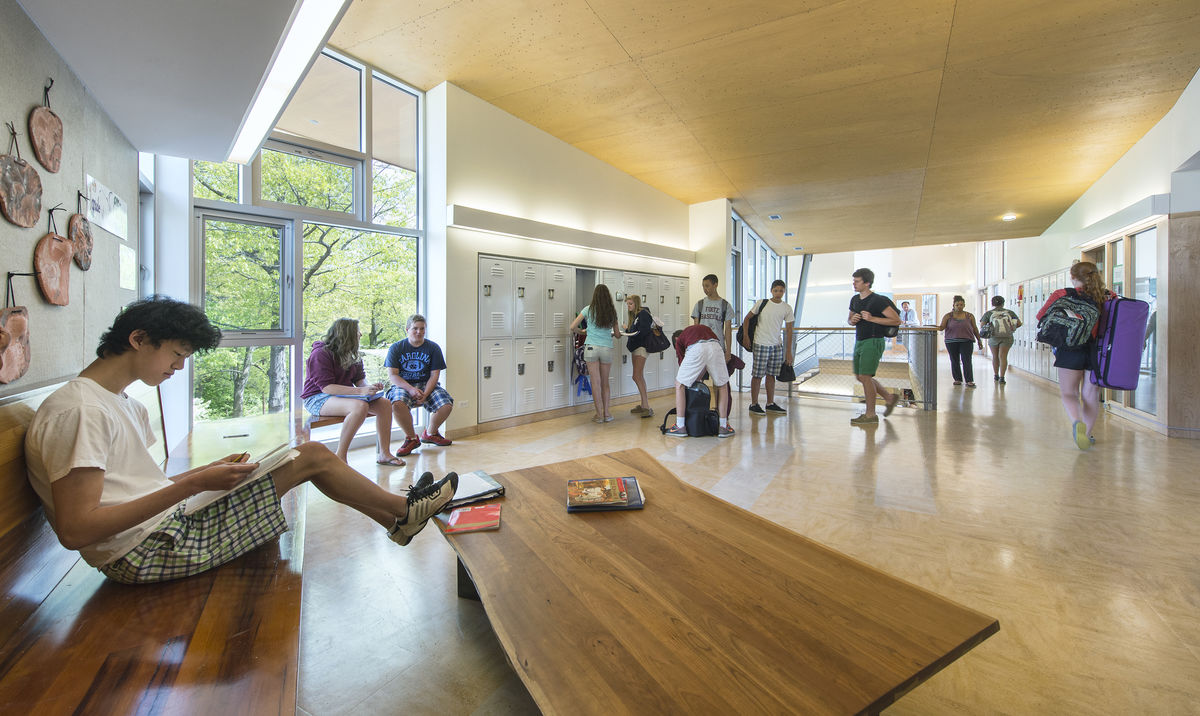The building’s placement and programming was developed with the school while studying the campus as a whole. The building engages and activates the campus creating a series of outdoor rooms and facilitating fluid connections through the campus and through the interior of the building. Benches of reclaimed wood line the wide and undulating circulation spaces, wrapping corners and adding to the fluidity of the space, while also creating intimate spaces for socializing and small group learning.