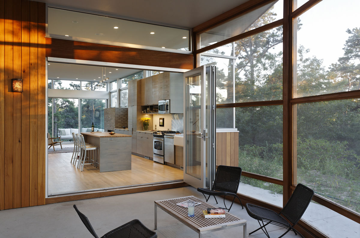 The plan of this summer house in Truro is divided between two volumes, the larger of which contains the primary living spaces, bedrooms and a study, while the smaller is designated as a guesthouse. A screened dogtrot, an outdoor passageway between the two structures, provides shade and ventilation and simultaneously joins and separates the two spaces. The kitchen opens to the screened porch with an accordion wall allowing the interior space of the house to become part of the large screened porch when open. A pivot at the dogtrot folds the house into the hillside and around a cluster of existing trees.