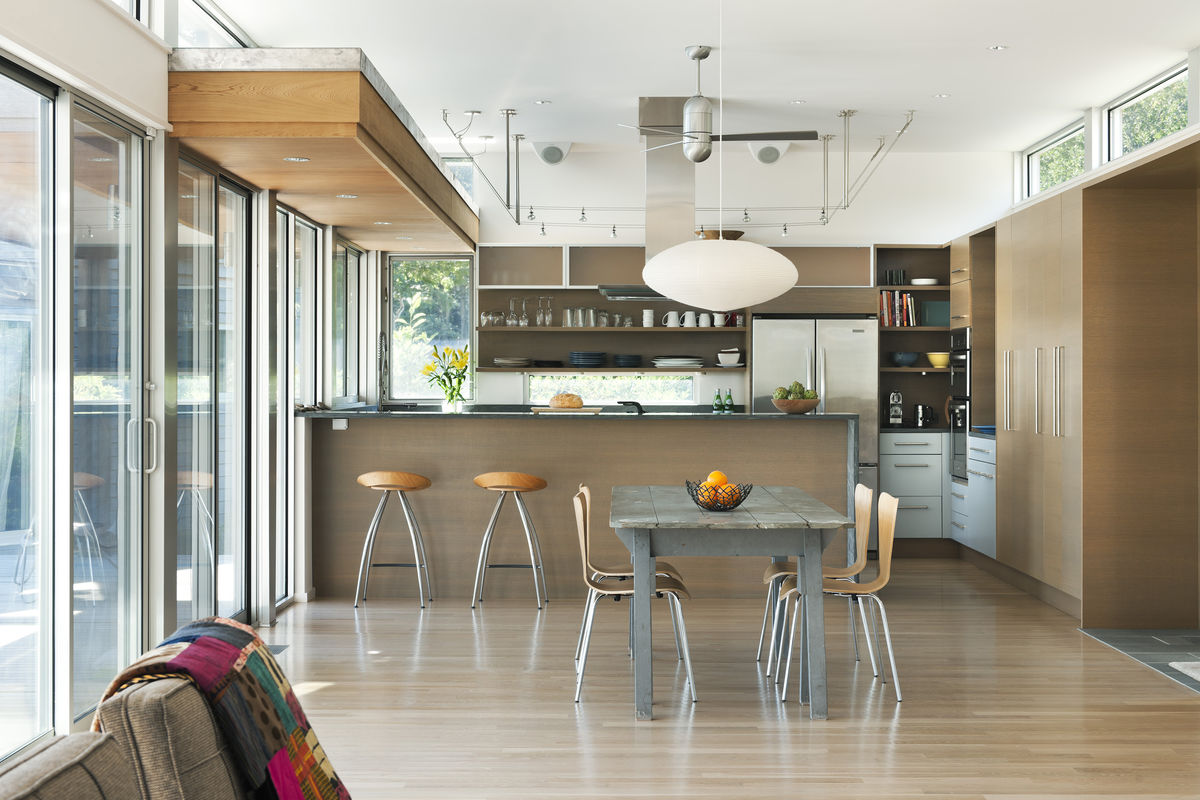 This 3,000 sf home sits on a hill surrounded by native meadow, shrubs, grasses and conifers. The design scheme takes advantage of southern exposure by opening all the living spaces to southern decks protected by overhangs, mahogany louvers and galvanized steel trellises. These elements create a layered presence on this sloped site and soften the edge of the house against the meadow and the ocean view. The site strategy reduces the impact on the site by reusing the existing foundation of an original house. The footprint is only expanded on the northeast to add the master bedroom in a more private corner of the site, while preserving the cedar and juniper trees around it, and adding a guest studio over part of the original driveway. The design also added a second floor with two roof decks to maximize the views of Pamet Harbor and Cape Cod Bay.
