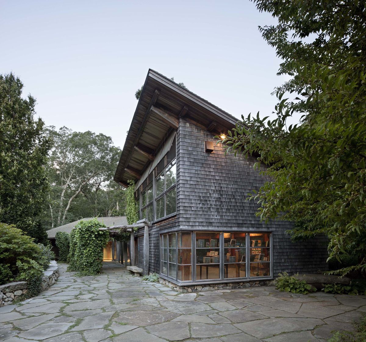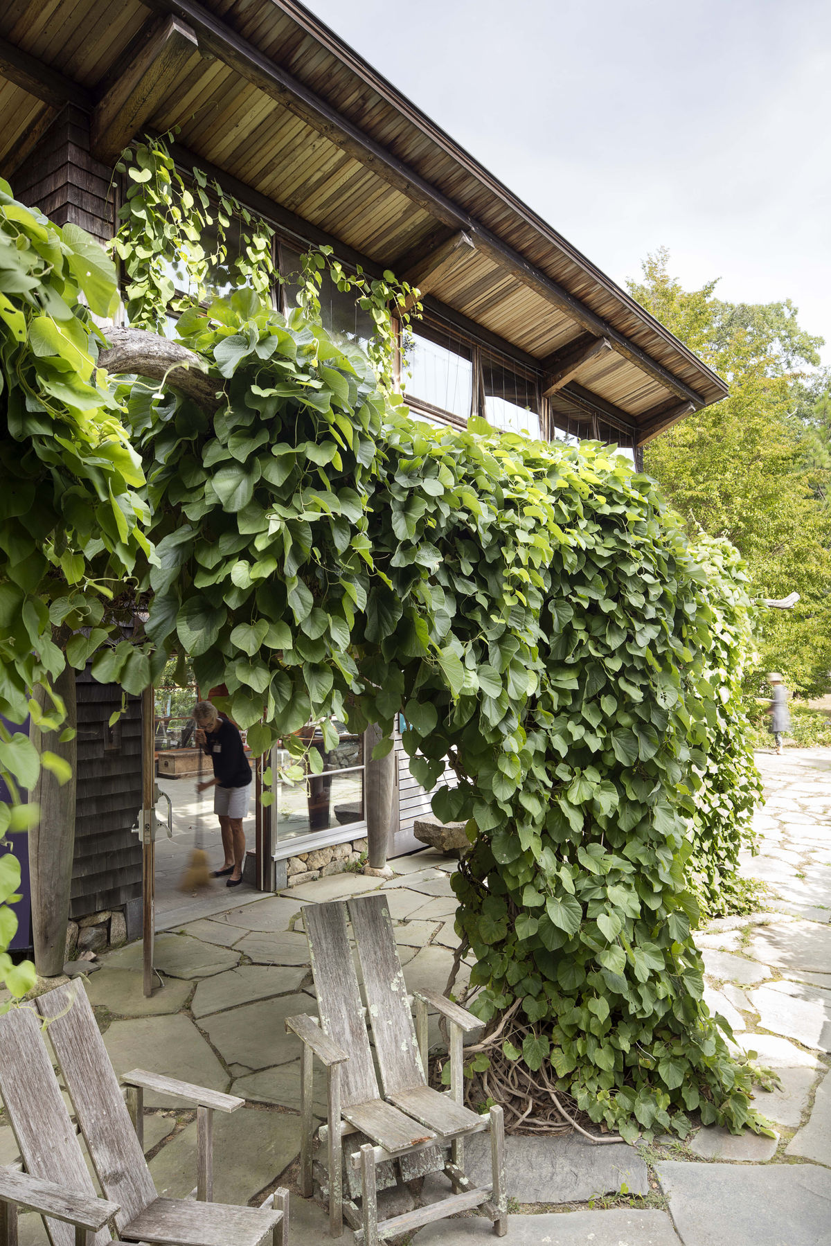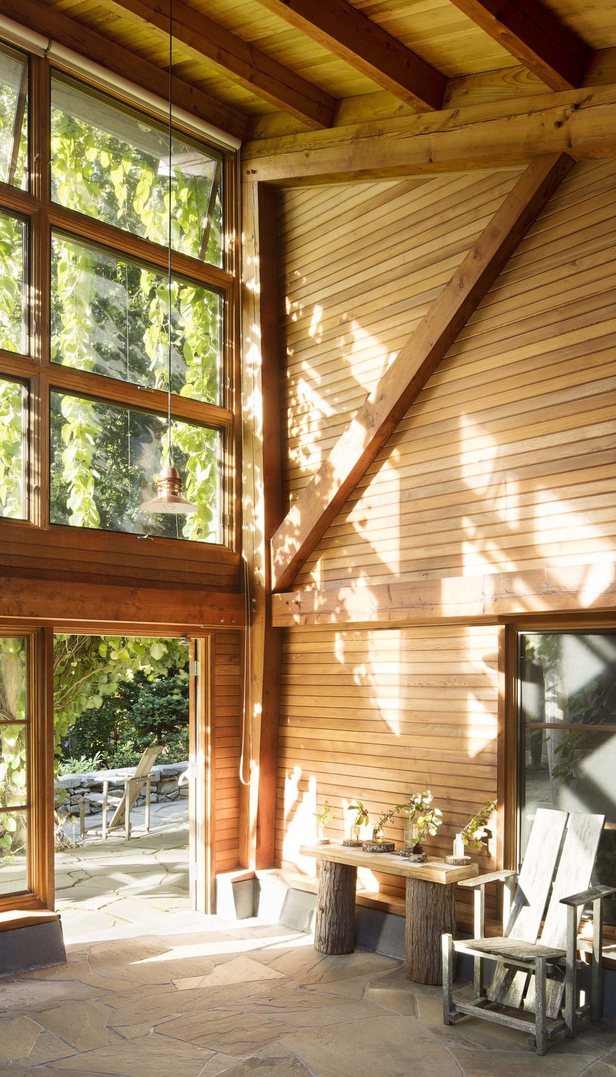 Architectural elements such as a window seat and skylight expand the interior volume out past the building’s heavy timber perimeter frame, pushing the interior into the surrounding natural site. Frosted glass, slatted walls, extensive clerestory windows, and skylights all reinforce the parallels of the visual and physical experience of the interior with the experience of the forest’s interior on the other side of the walls. The skylight allows for the quality of light that one finds within the forest canopy. The wooden buildings are heavy timber Douglas fir construction, reminiscent of the old barns of New England.