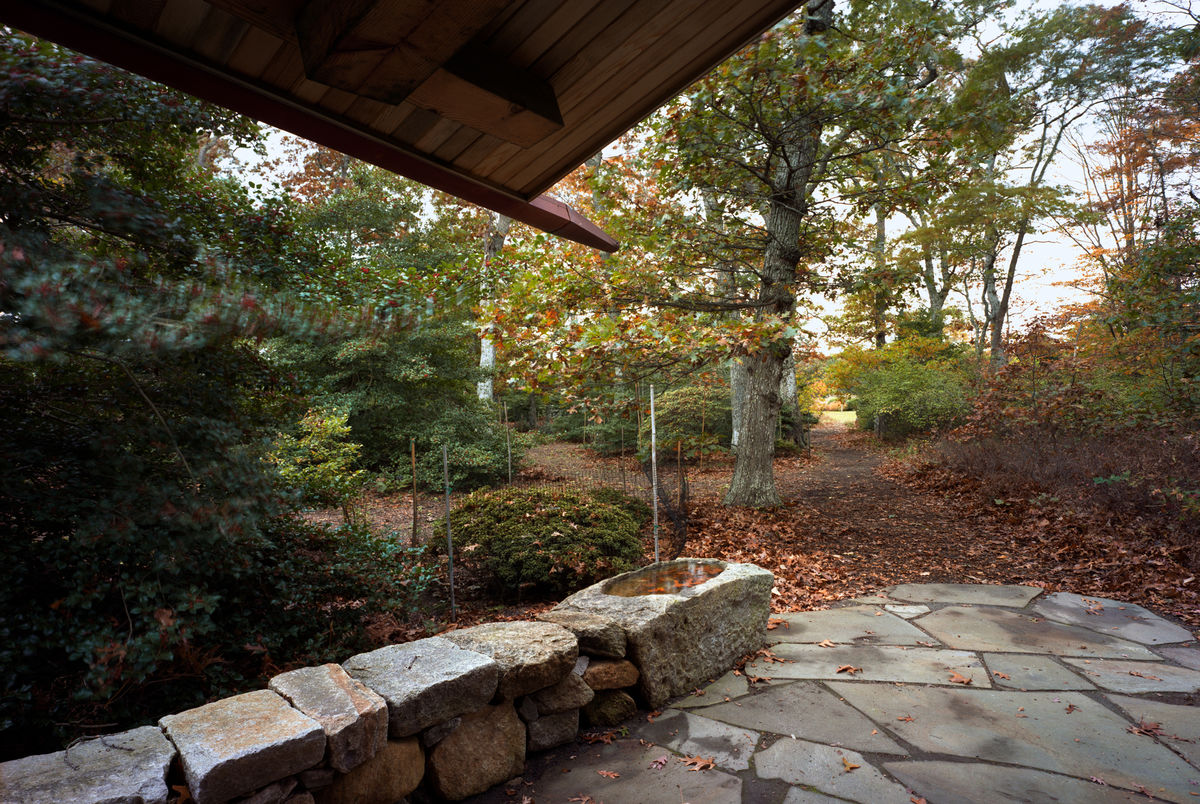 The material palette of stone, Douglas fir, yellow cedar, and copper was selected primarily for its durability and graceful weathering. When it rains, the single pitch roofs divert the water into scuppers, which create two small waterfalls. Benches are placed so visitors can shelter themselves from the rain while enjoying the sound and view of the falling water.