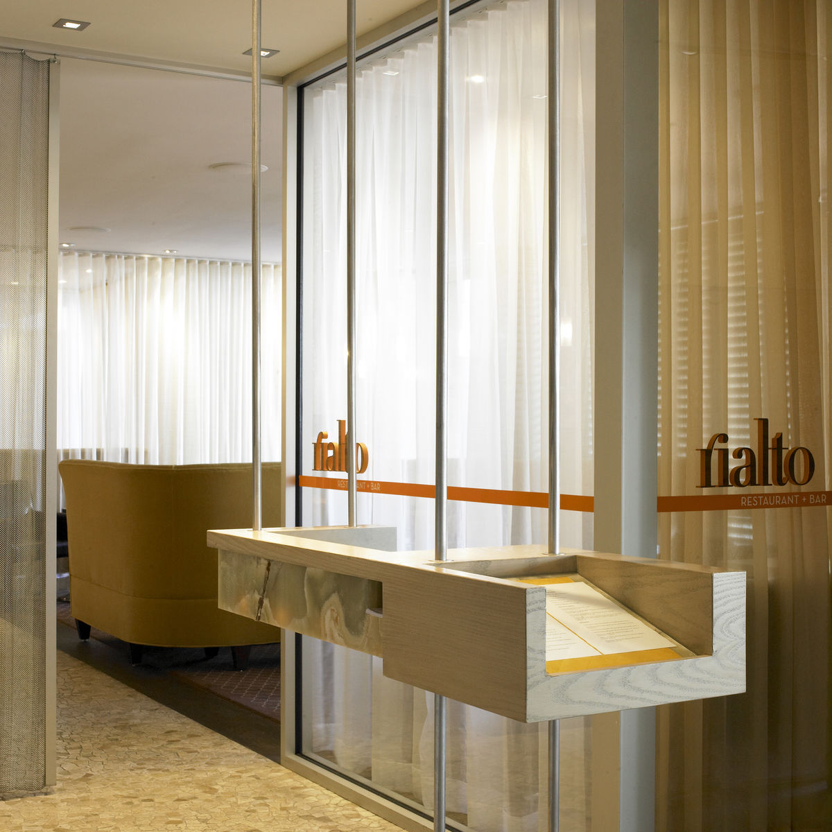 The concept for Rialto employs unfolding spatial sequences layered with moments of repose and intimacy. At the restaurant’s entrance, a corridor of mosaic tile defines a pathway which guides one’s passage through the L-shaped lounge into the dining room. Sheer curtains hang at intervals throughout the sequence providing moments of intimacy and shifts in scale without disrupting sightlines or rigidly enclosing the space. Light is layered and filtered. At the onyx-topped bar, light filters through the stone surface to illuminate the wait staff from below, elevating the simple activity of drink preparation and service into a performance.