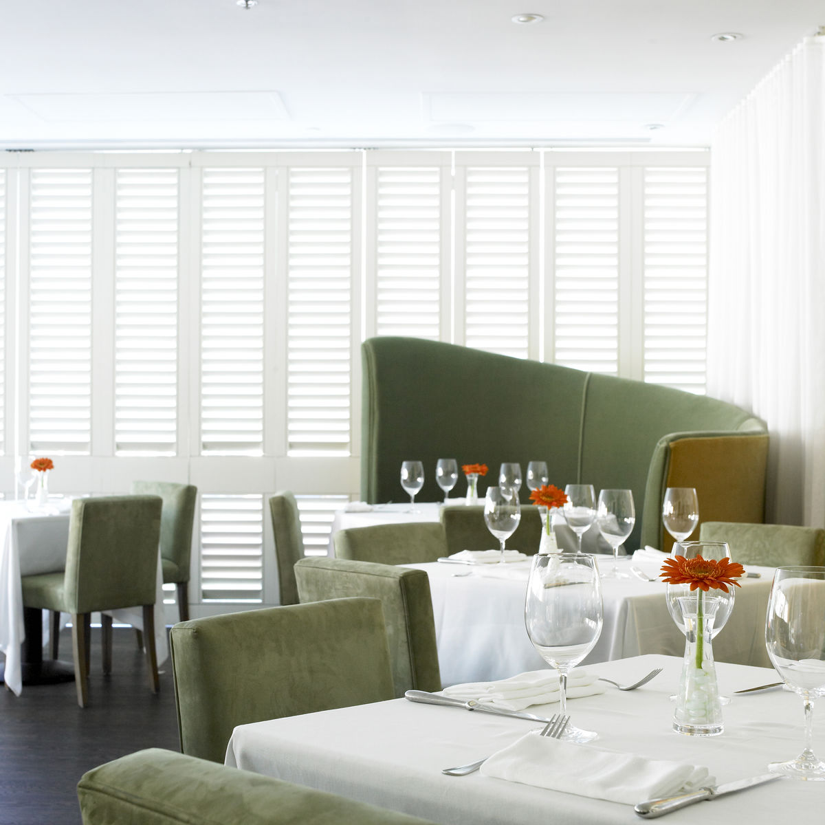 The arrangement of circular banquettes in the dining room alternatively reveals and conceals views of other tables, providing intimacy and enclosure or a vantage point from which patrons can watch other diners. The palette of natural materials such as onyx, quartz, mahogany, mohair, and suede creates delicate and complementary relationships as they play off one another. Esquire magazine described the restaurant as “one of the most romantic restaurants in the country.”