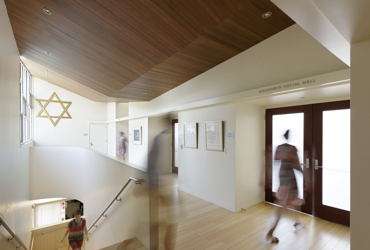 The building guides the user from the street to the interior sacred spaces through an unfolding spatial sequence activated by natural light. The brick that holds the space of the sanctuary on the second floor descends to the terrace at the street as a delicate screen, creating a thickened entry threshold. Passing though monumental doors, salvaged from the previous temple, one enters a space dappled with light between the brick screen wall and the building. Moving toward the entry, one emerges from behind the wall and returns to the space of a trellised garden that links the building to the street. Once inside, light spilling from above reveals the stair to the sanctuary, beyond the “schmoozatorium”, or social gathering space, which faces the garden. Reaching the sanctuary, the curved bamboo and glass eastern wall creates a more enveloped and introspective feeling. The spiraling movement of the roof upward and to the east parallels the journey from the street to the sacred space of the sanctuary and focuses the view upward to the sky.