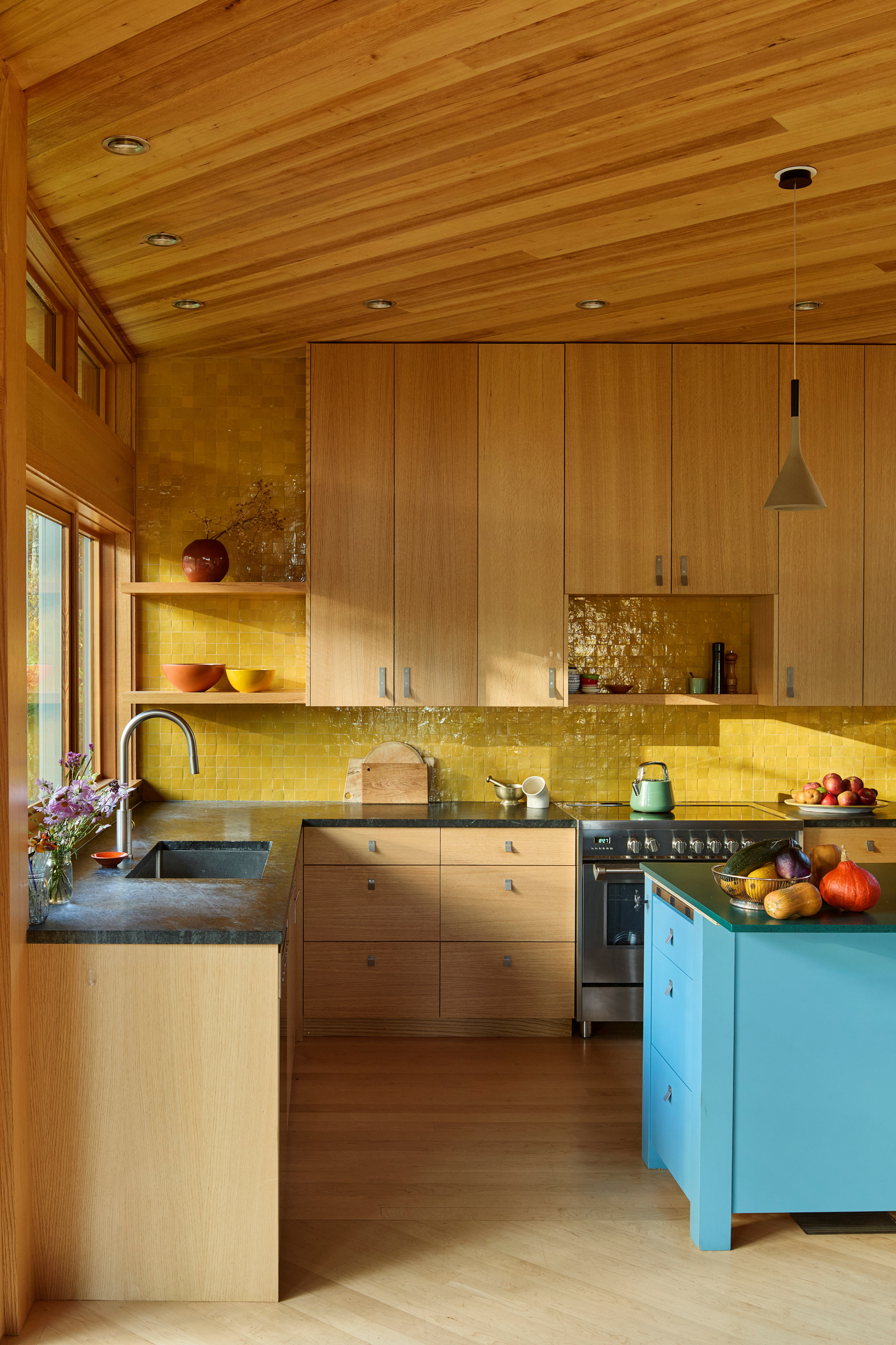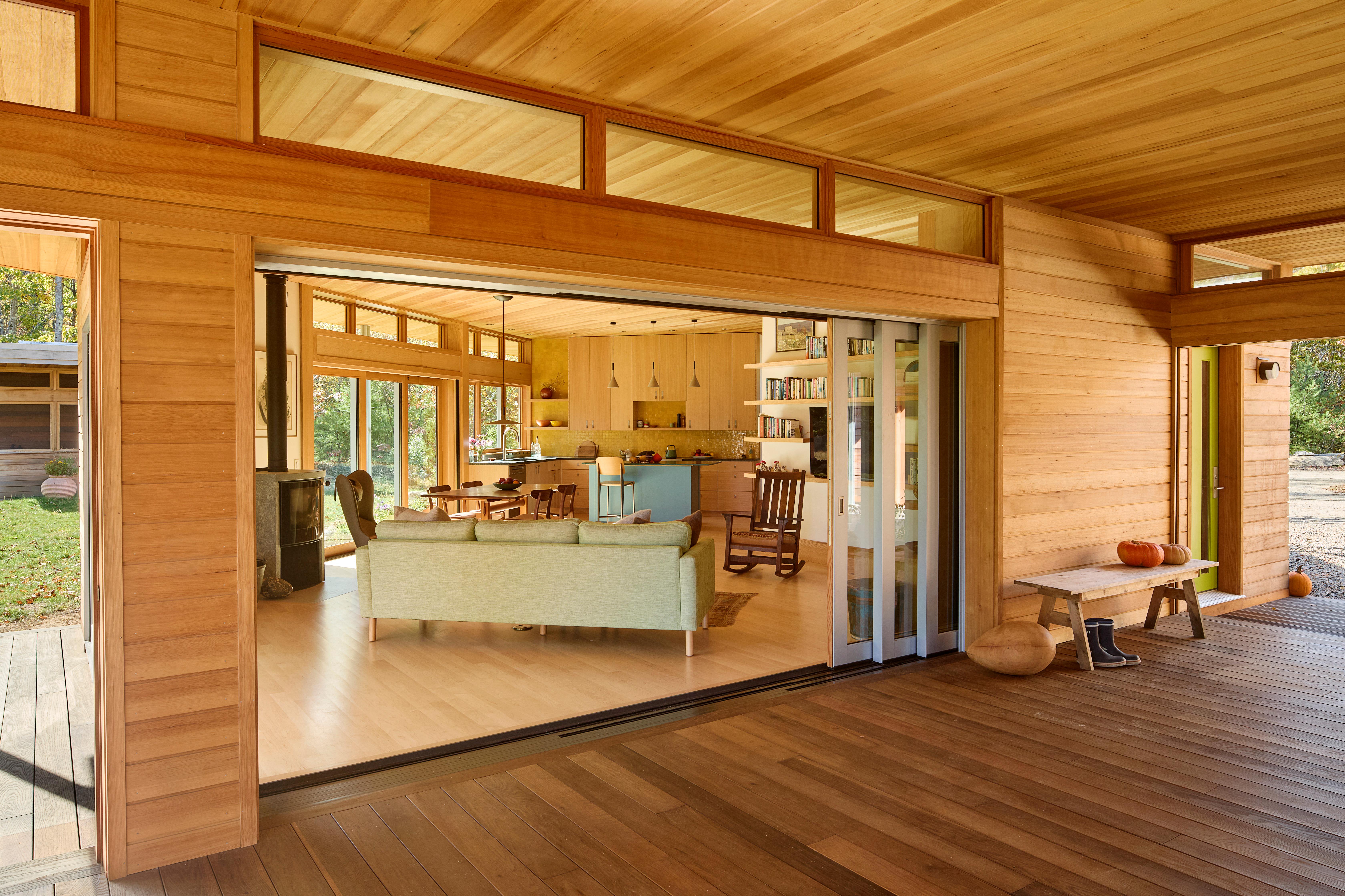 Phase 3, the Main House, now anchors the property. Nestled among rocky outcroppings, it serves as the keystone, linking the Pool House, the Studio, and the surrounding landscape. The house includes a full kitchen, living areas, bedrooms, studies, and a garage, organized in a dogtrot layout. This layout divides the home into three distinct zones - the kitchen and living area, the primary bedroom suite, and a second-floor bedroom with its own roof deck -while a central screened porch with fully retractable doors threads them together. The dogtrot screen porch (affectionally called the "Cat-trot" in homage to the family's feline members) forms the heart of the home, opening the living spaces to the landscape, providing privacy for the bedrooms, and welcoming summer breezes that naturally cool the interiors.