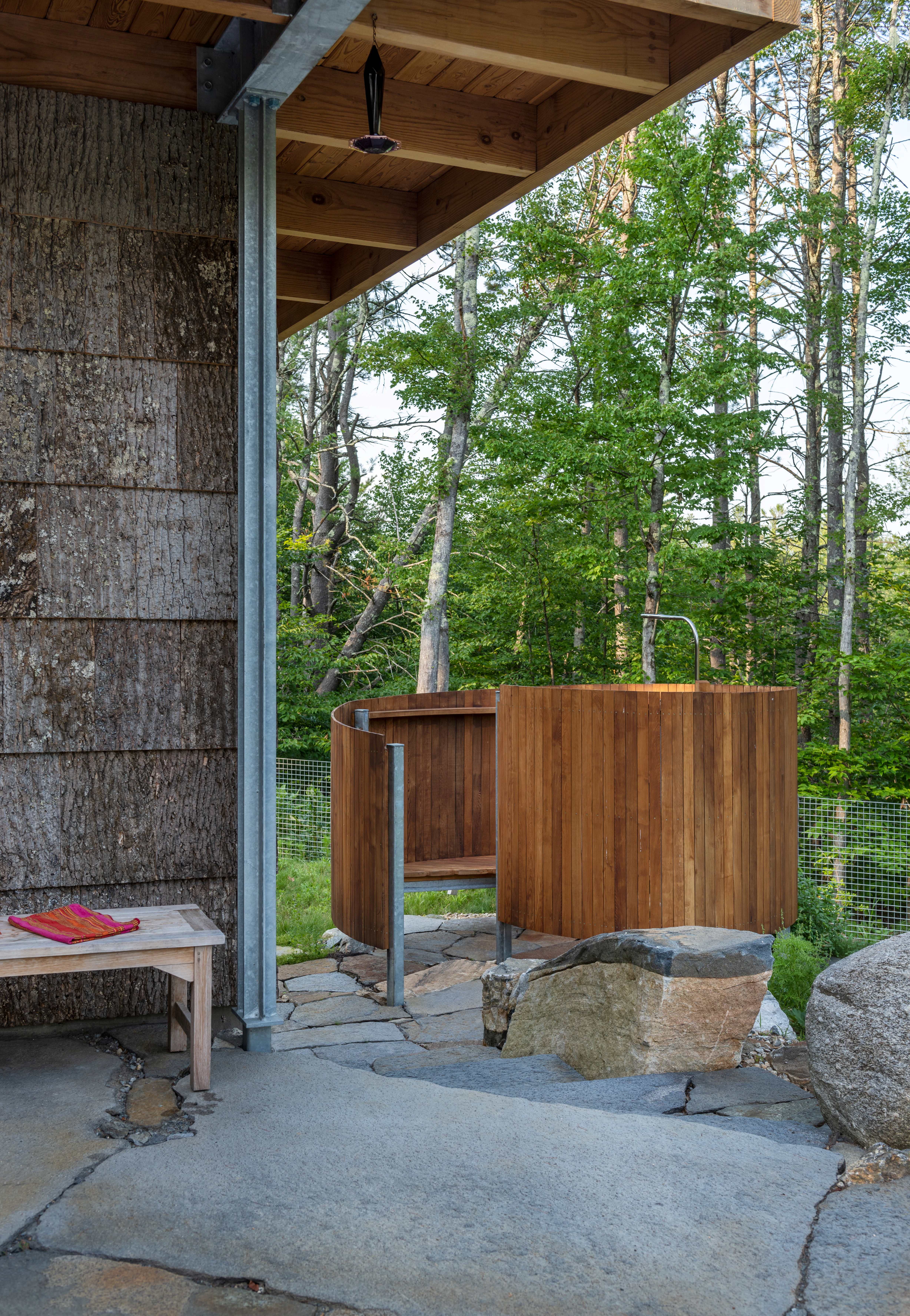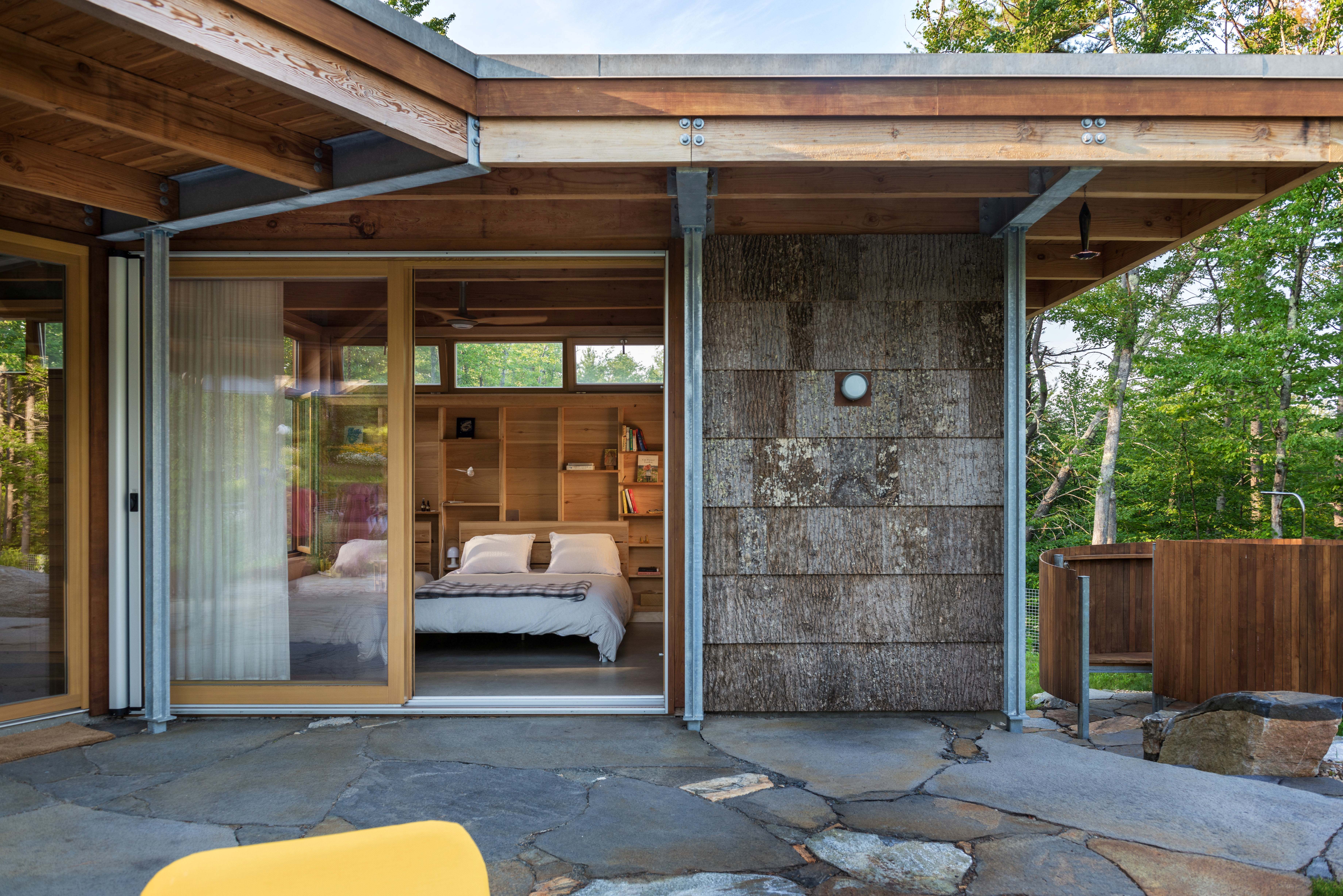 The structure is expressed with clarity and restraint. A simple steel and timber frame is left exposed, with slender steel double-tee columns set apart from the primary enclosure. This separation allows the pool-facing façade to open completely, transforming the building into an outdoor room that invites light, air, and movement through the space. Material choices reinforce a sense place. Interior and exterior finishes are composed almost entirely of wood, creating a cohesive and tactile environment. Bark shingles wrap one end of the structure, a subtle reference to the surrounding forest and an early exploration of themes that continue across the site. The pool house and its adjacent water feature are set within a carefully shaped landscape of flower gardens, stone patios and pathways, and a wildflower meadow.
