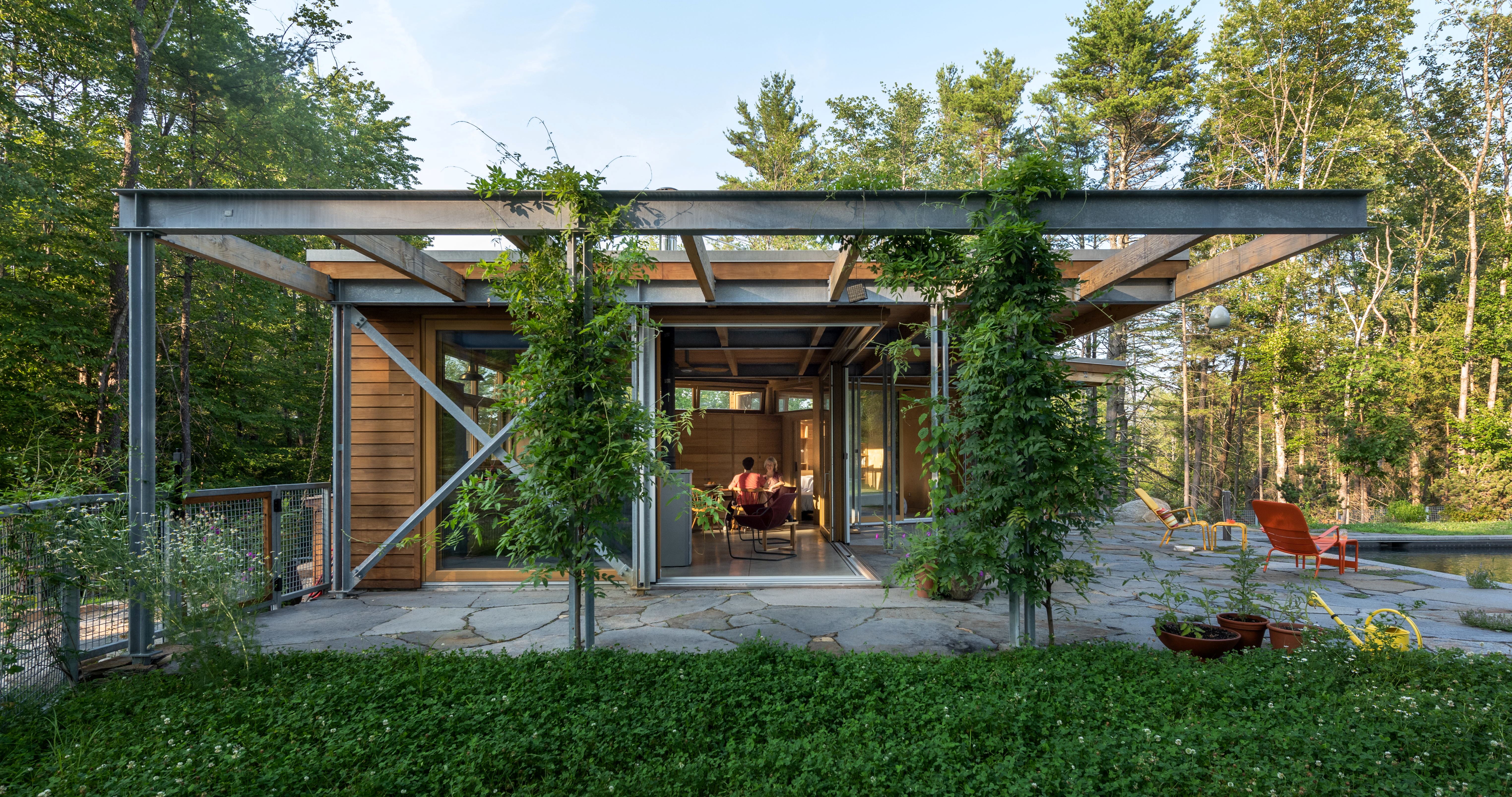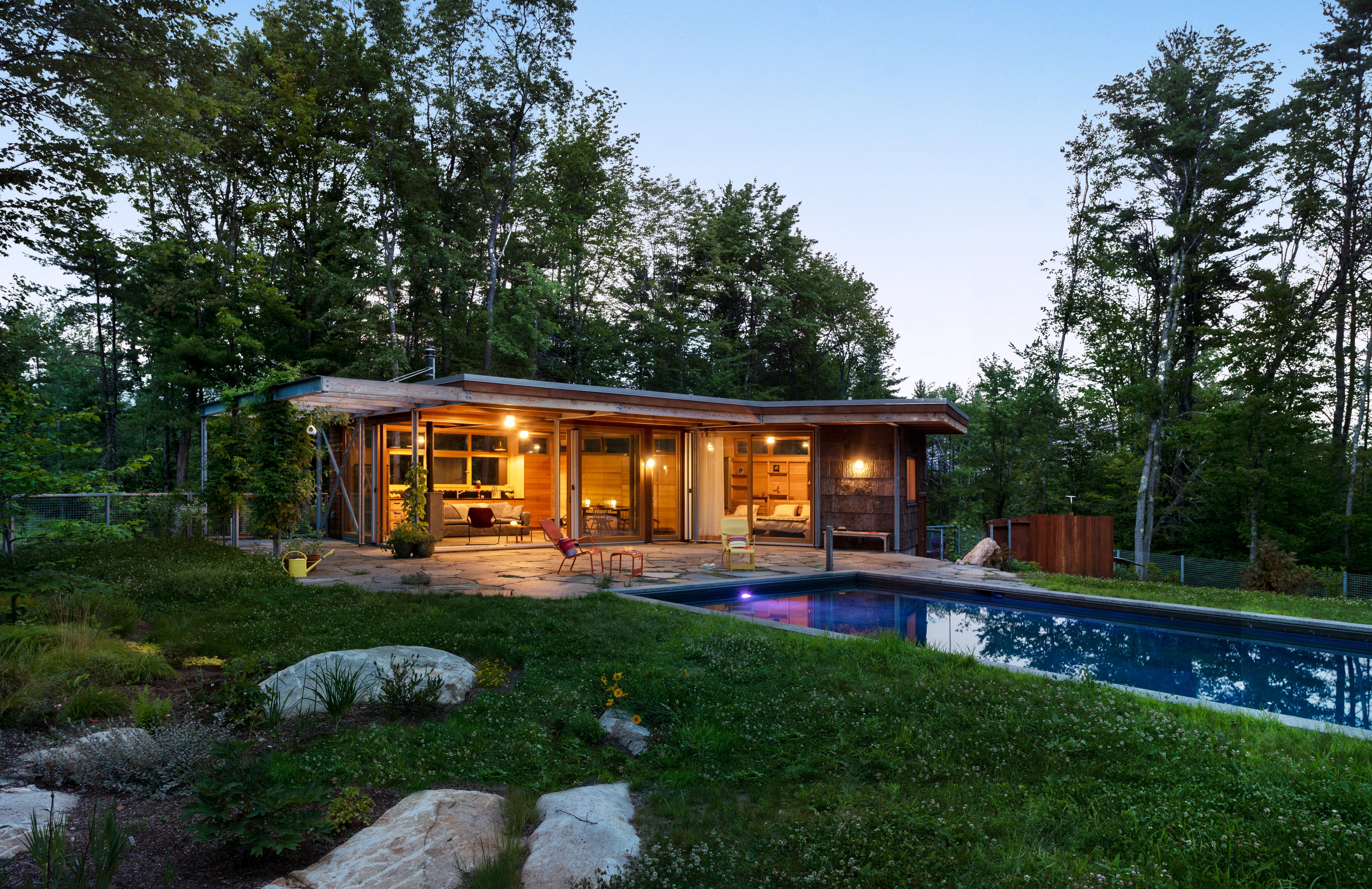 The West Hill Pool House is sited within a densely vegetated landscape in western Massachusetts and was conceived as the first phase of a larger vision for the property, which now includes a studio, main house, and cultivated grounds. As the initial intervention on the site, it established a quiet retreat and set the architectural language for what would follow. At its core, the pool house is a three-season structure, with more porch than enclosed building, designed to open fully to the surrounding landscape. Positioned as a bookend to a small swimming pool, it blurs the boundary between interior and exterior. Though only minimally heated, usage of the space extends into the colder months with the addition of a wood-burning fireplace, offering warmth and comfort well beyond the summer season.