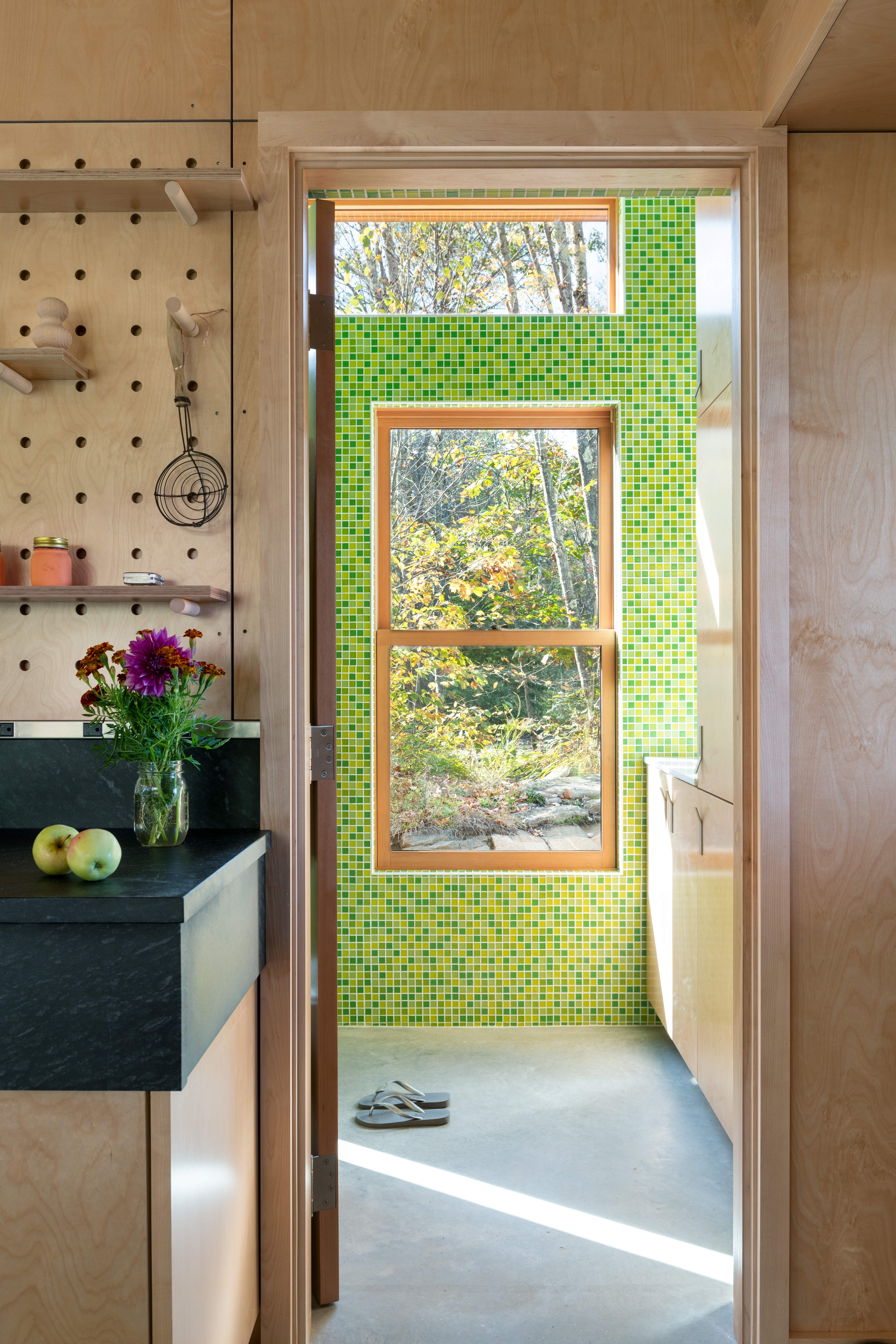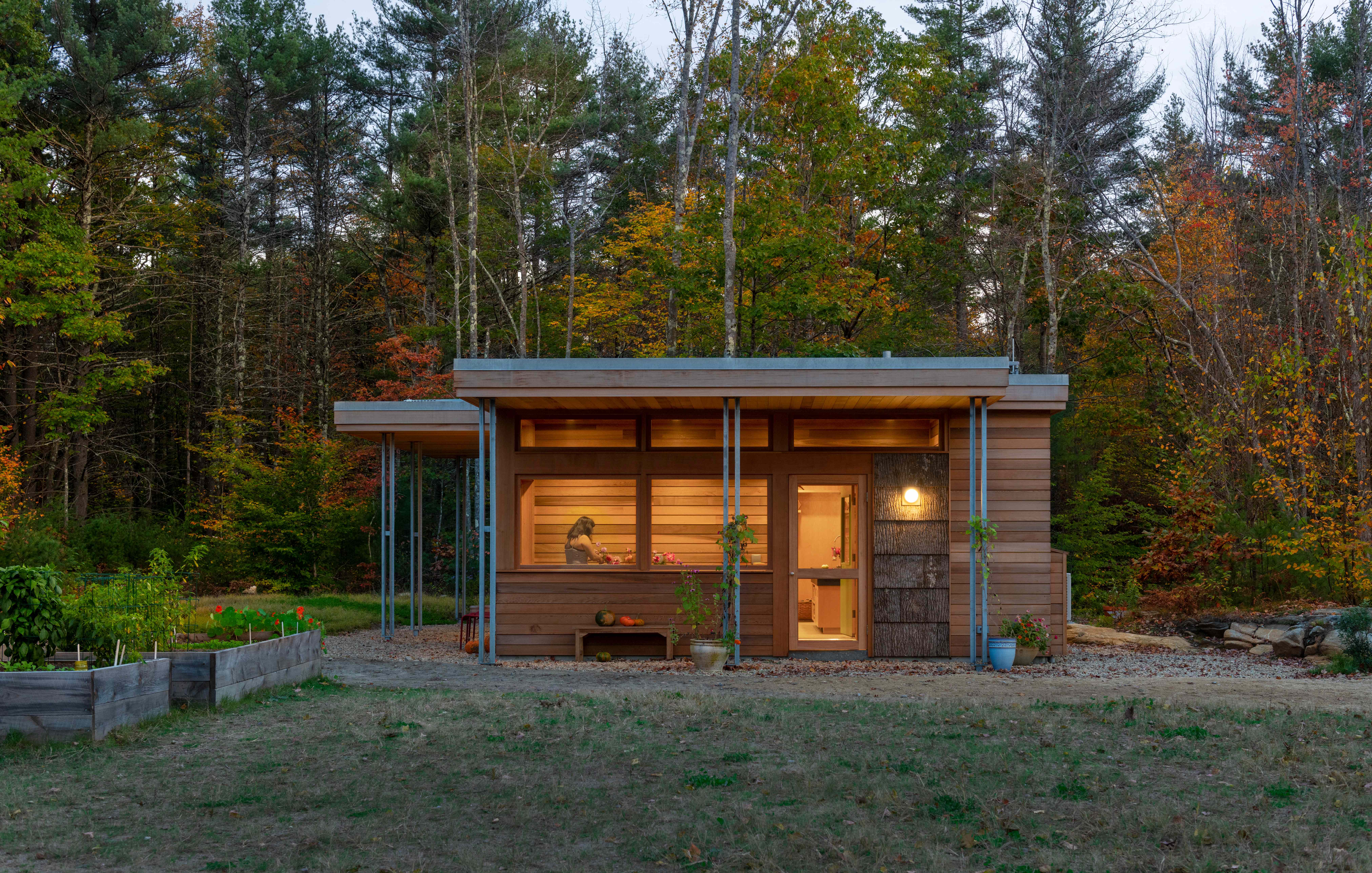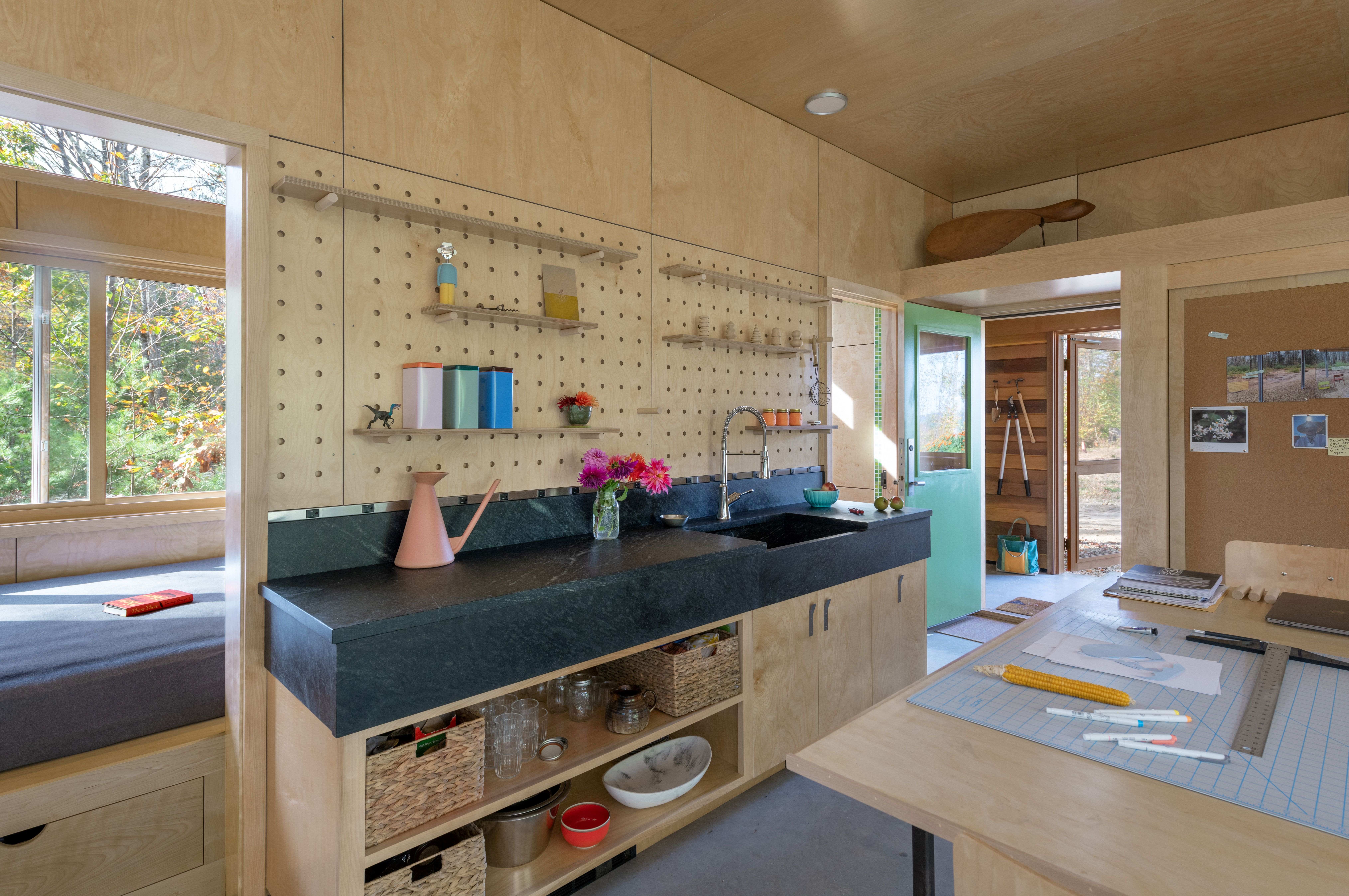 The compact studio includes a work surface, sink and cabinet storage, full bathroom, built-in bed niche, and a gardening workshop. Large glass doors and windows bring in abundant natural light and cooling summer breezes, and generous overhangs allow for passive solar shading and an outdoor seating area protected from the elements. The exterior material palette extends across all project phases, featuring an assortment of natural wood-based textures: birch bark shingles, white pine siding, and yellow cedar trim and fascia. Natural wood finishes clad the interior, punctuated by bursts of color that evoke a sense of creativity and playfulness.